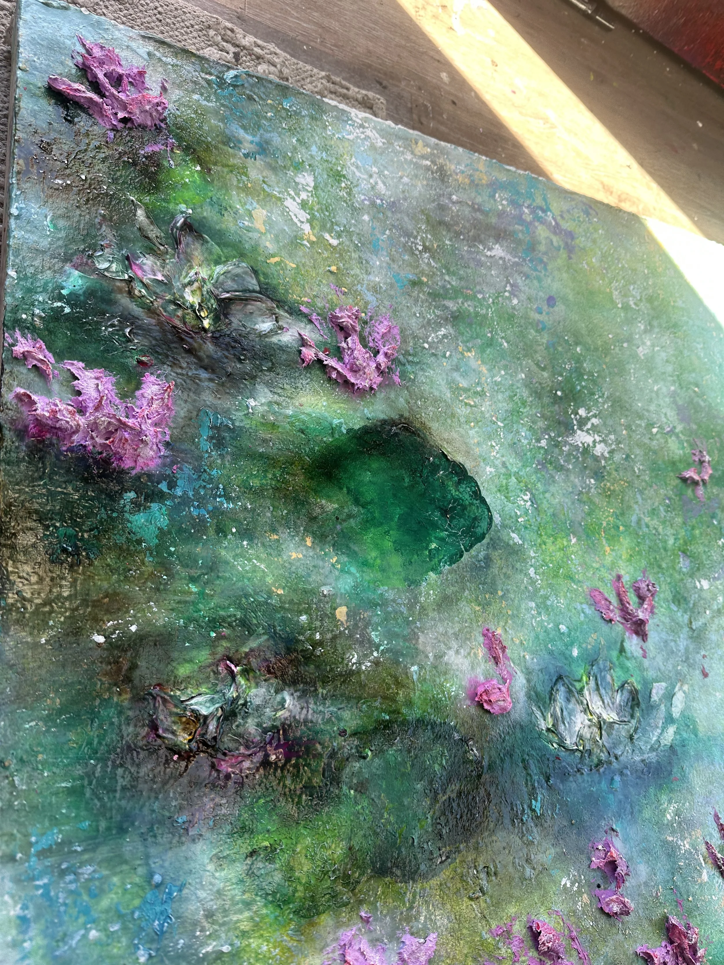 Using sculpting compound, I molded more blooms with a brash and pallet knife, let them dry slightly, then started contouring/painting them. Adhere the edges of the thick blooms with gel medium. 5ft #flowerart #floralartwork #kelliethomaswalker #art #artist #paintings #largeart #waterlily #artwork #artdealer #artcollector #origionalart #abstractart #expressionistart #writer