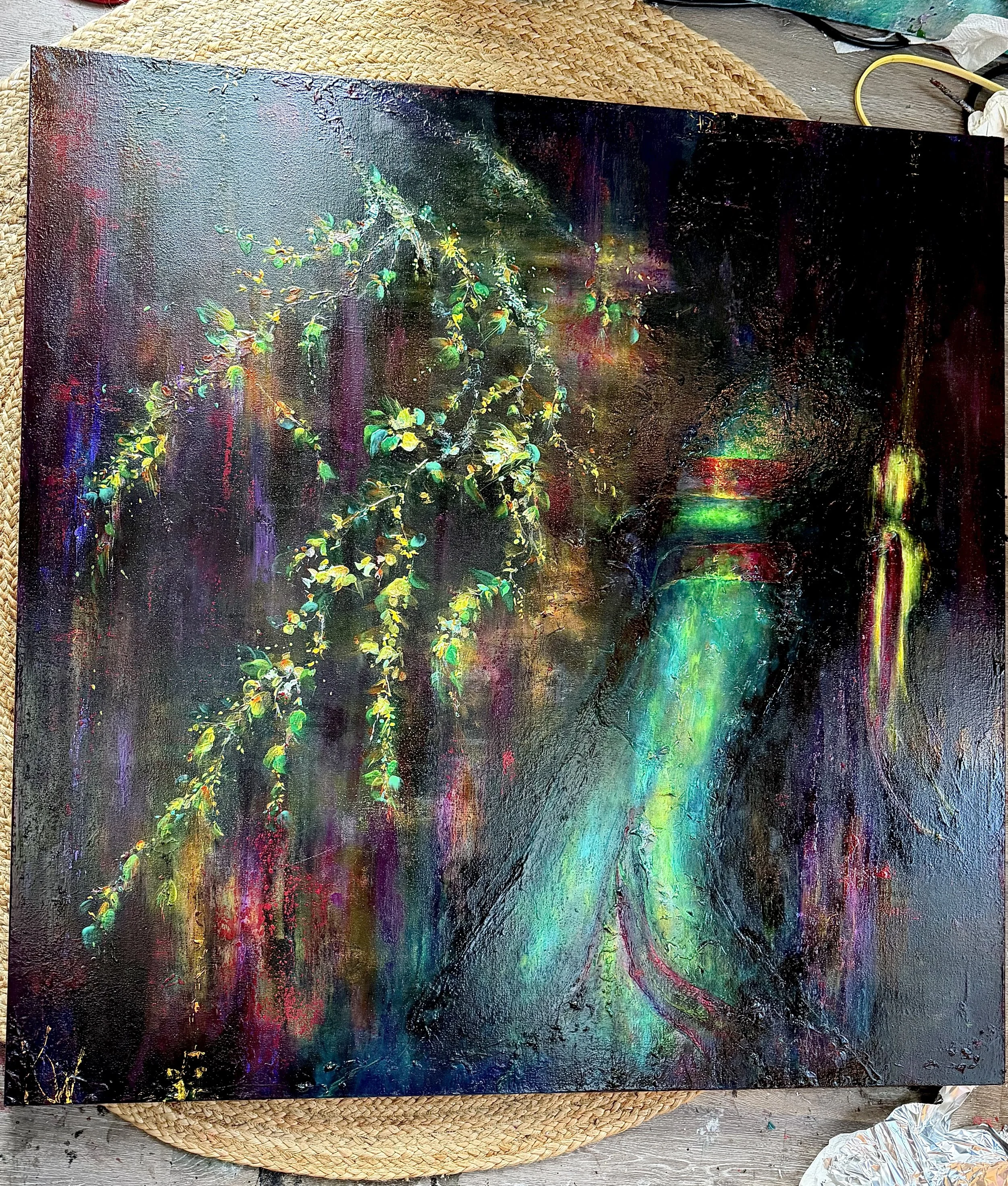 Giving much needed depth to a 48x48 that I painted, oh-like ten years ago. The learning process can take time. The most important thing, is to keep on growing as a soul. Find peace. #painting #art #kimono #kelliethomaswalker #kimonopainting #artwork #contempraryart #modernart #artist #artcollector #paintings #paintingoftheday #origionalart #artgallery #brushwork #longbeach #losangeles #california #writer #femaleartist