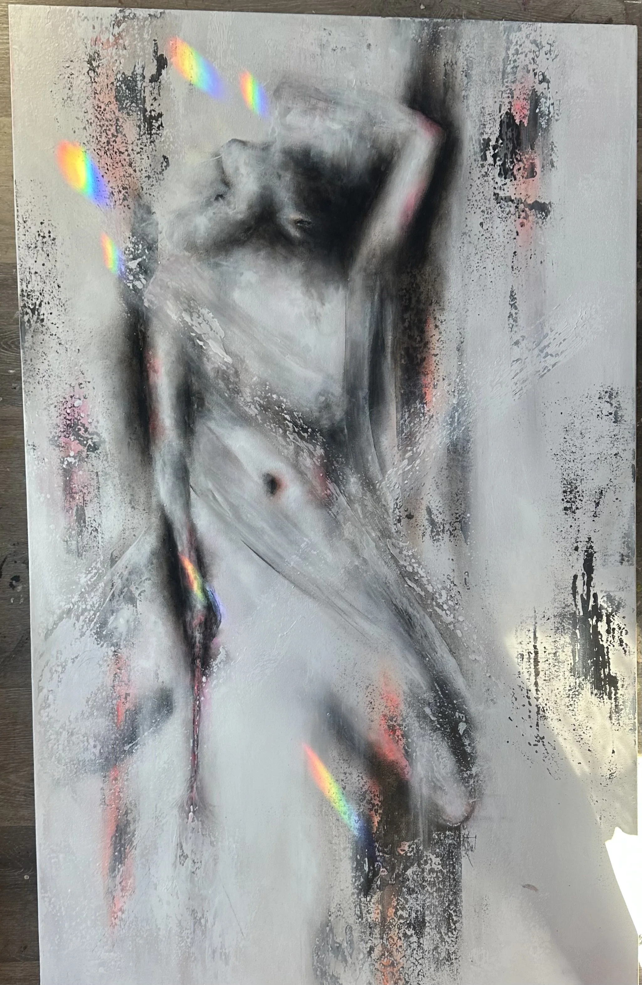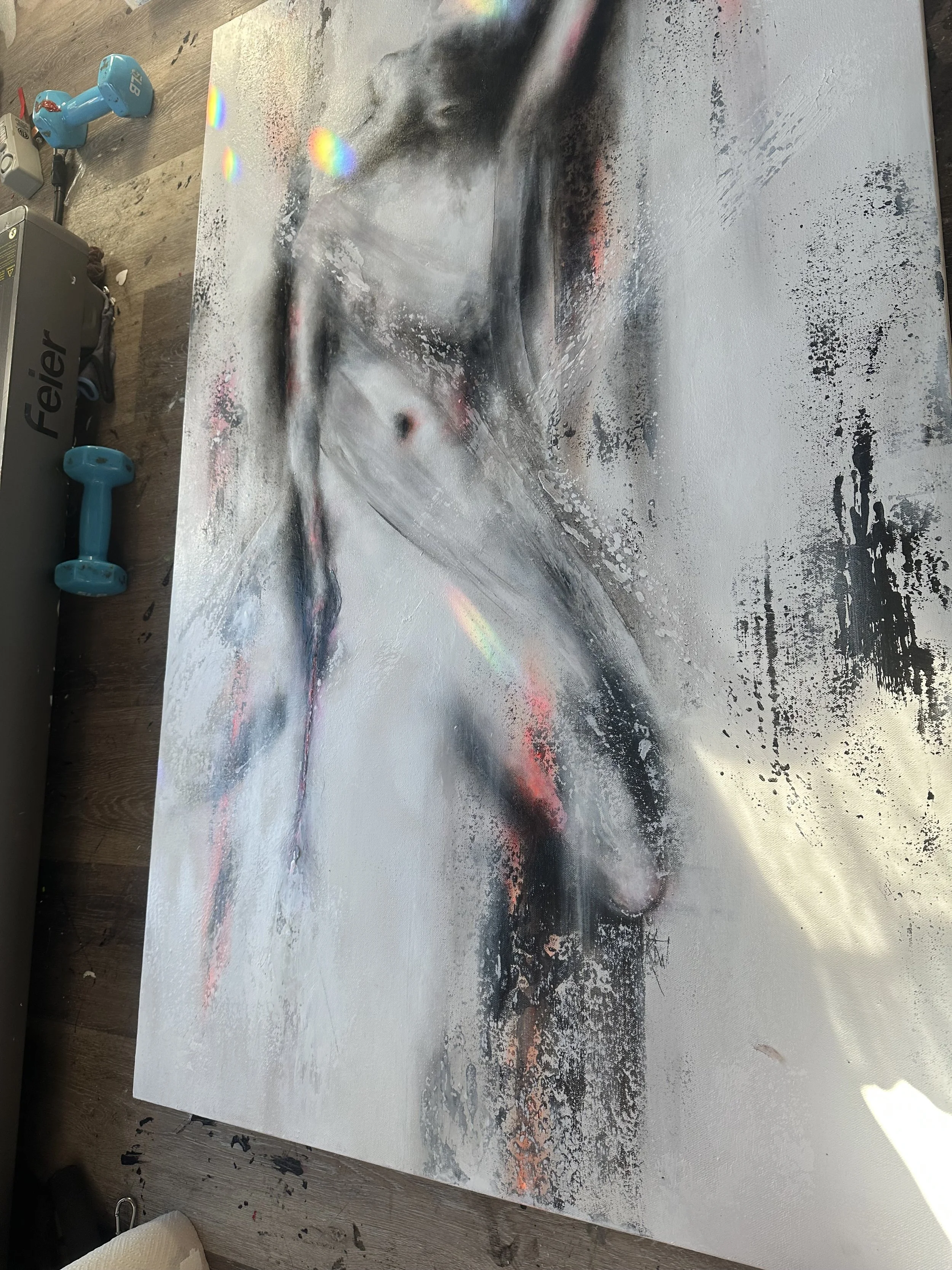 The 4pm sunlight pierces the prism I have hanging in my studio door. I LOVE the rainbows. Almost done with her. Has anyone seen “Spaceman” on Netflix, starring Adam Sandler. It reached me, and I can’t stop thinking about it. I have been painting to the score for about six months before watching it. Kinda think it wouldn’t live up to my expectations. #art #painting #artist #figureart #kelliethomaswalker #writer #contemporaryart #modernart #artgallery #fugurativeart #figurativepaintings #abstractart