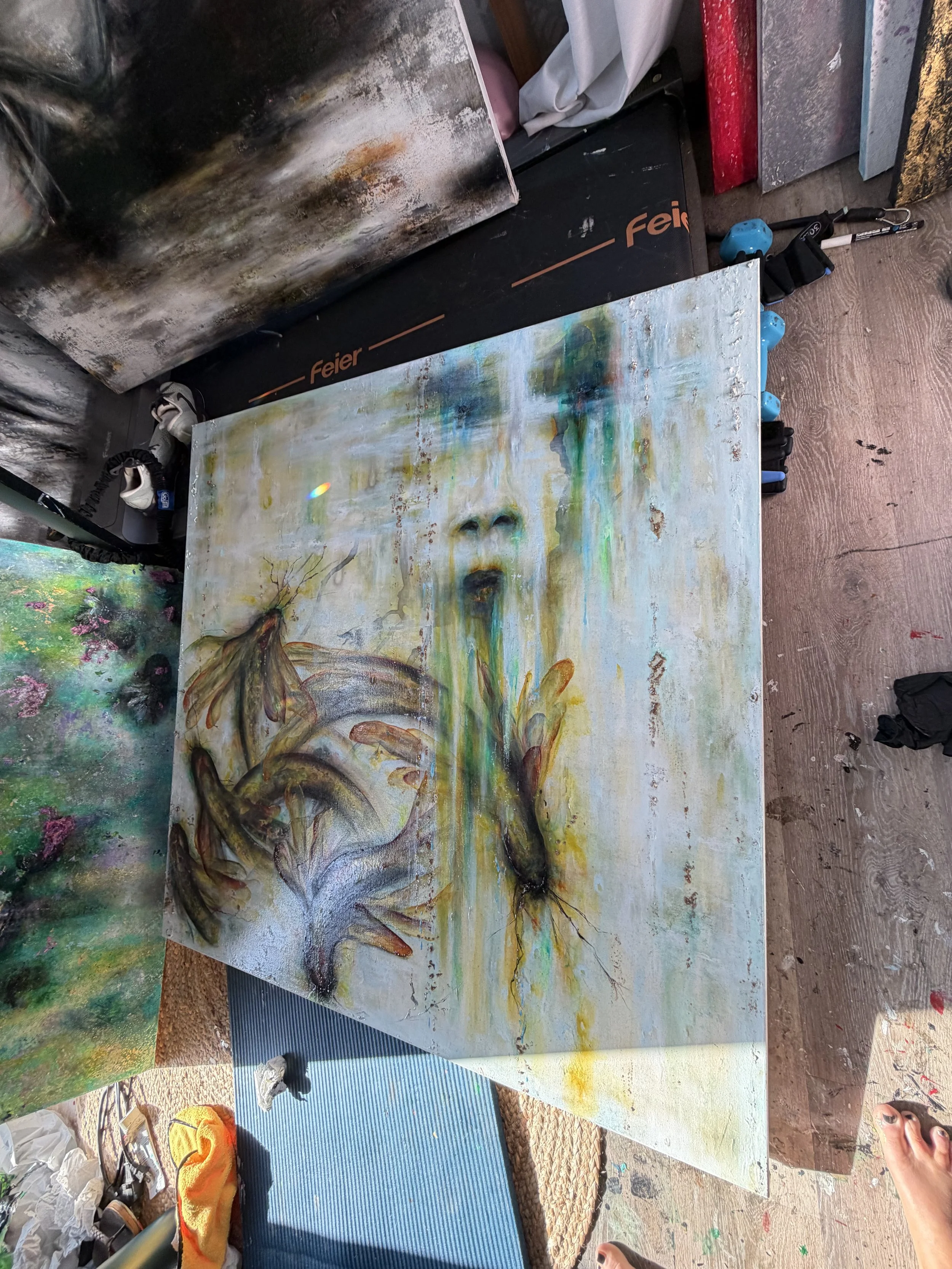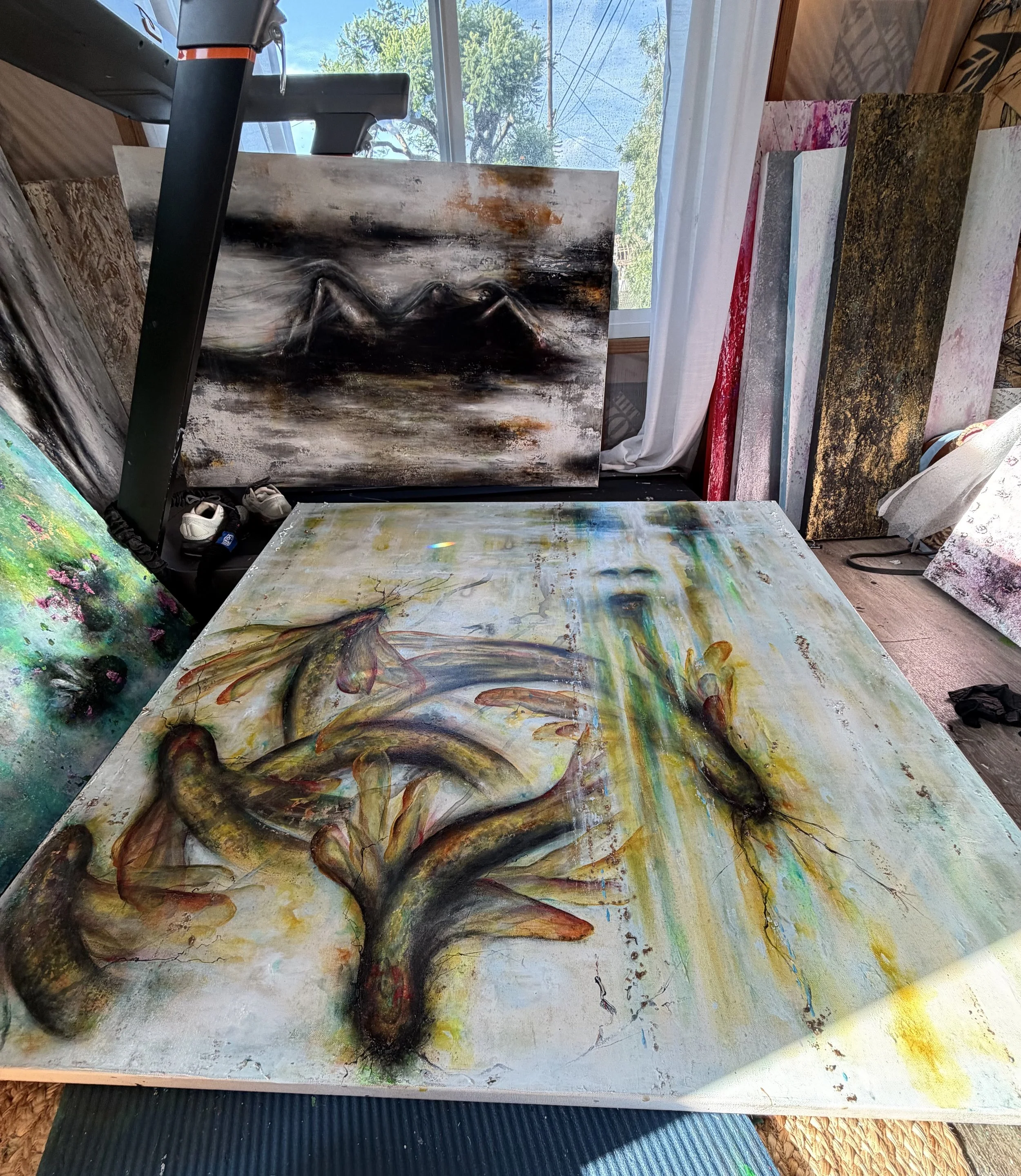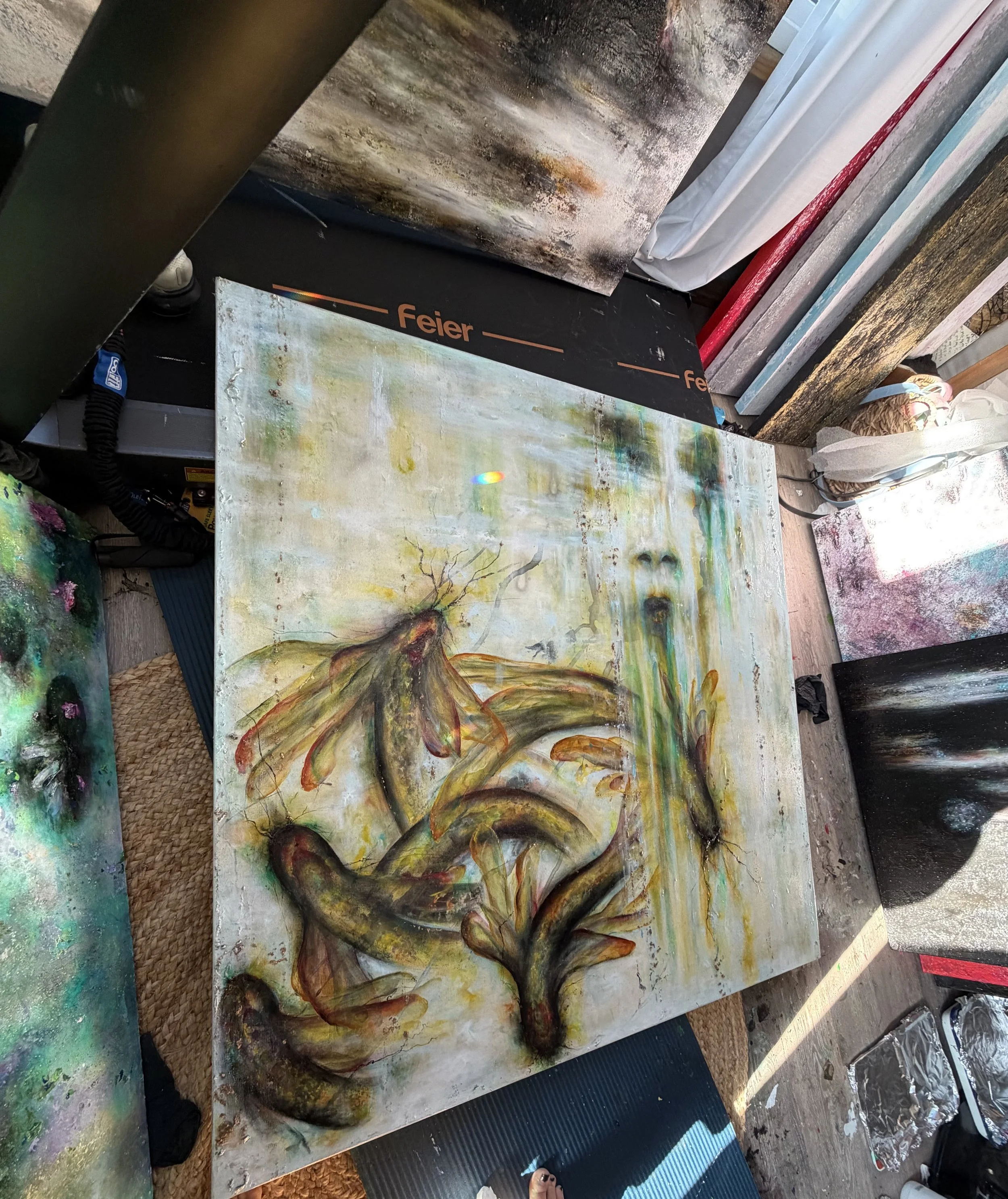 Started the background for the Lily/koi pond for my daughter and her husband’s new home in Virginia. 48x48 background start. #art #painting #artwork #artist #femaleartists #artstudio #artcollector #fineart #largescaleart #lilypond #kelliethomaswalker #contemporyart #modernartwork #artlover